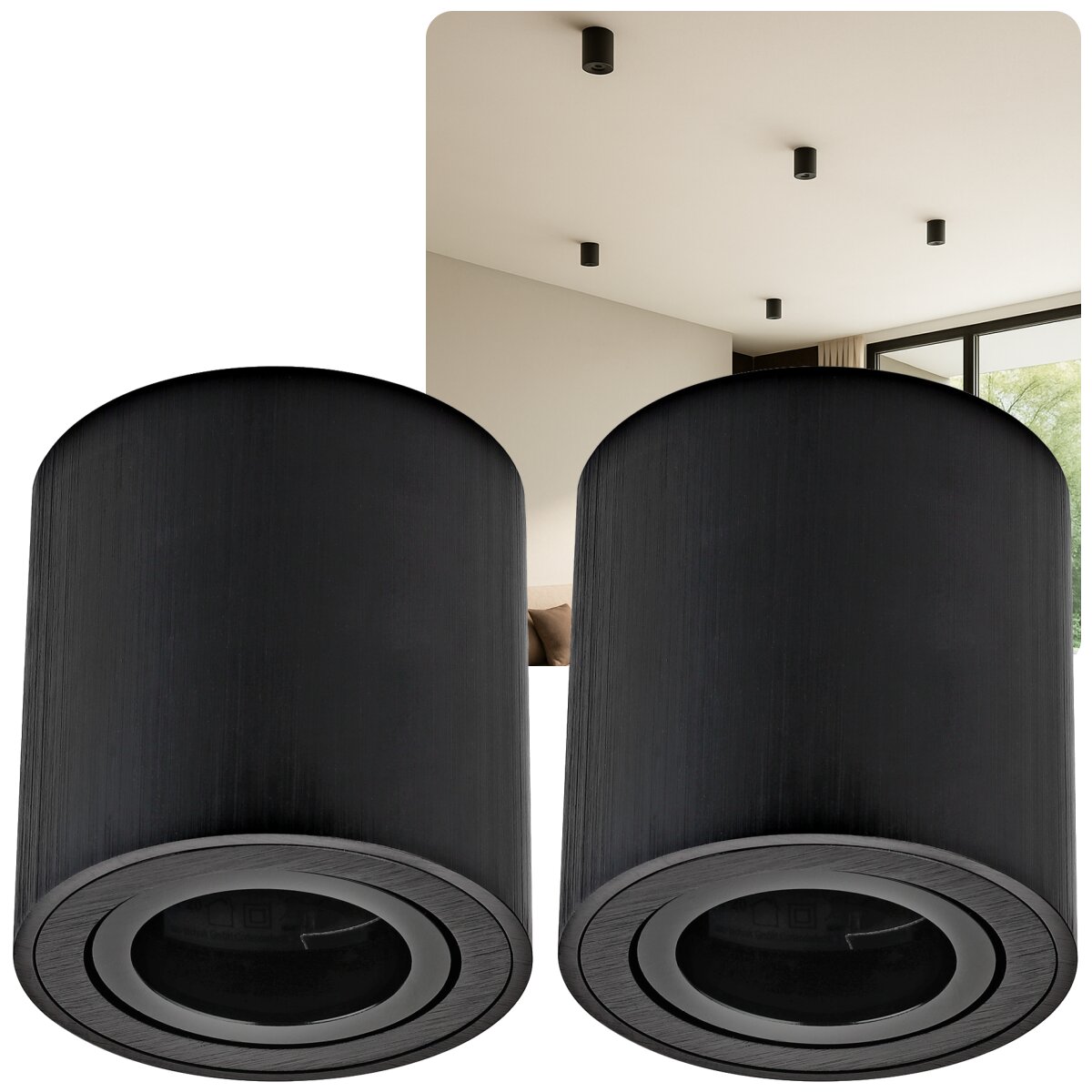 2er Set LED Aufbaustrahler GU10 Schwenkbar Schwarz Gebürstet | 230V Aufbauspots Aluminium Rund