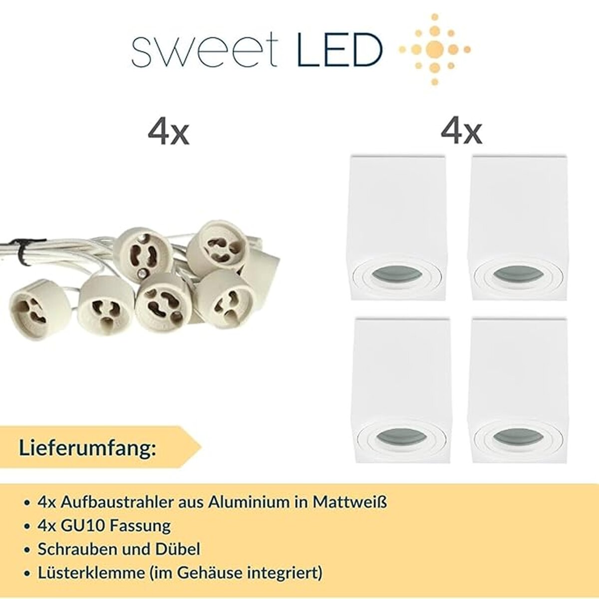 Bringen Sie modernes Design und langlebige Qualität in Ihr Zuhause: Die LED Aufbauspots 230V GU10 von Sweet LED vereinen hochwertige Verarbeitung, stilvolles Aluminiumgehäuse in weiß matt und zuverlässige Beleuchtung. Dank der robusten Bauweise eignen sich die Deckenspots Aufputz ideal für Badezimmer, Küche, Wohnzimmer, Schlafzimmer oder überdachte Außenbereiche und sorgen in jedem Raum für eine elegante, moderne Lichtlösung.